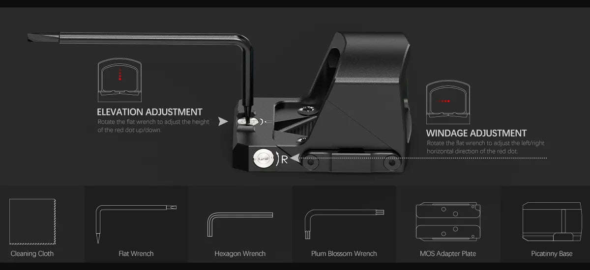 10 levels of brightness adjustment to adapt to different light, with brightness memory function; the included tool can be used to adjust the wind deflection and elevation angle, 1 MOA click value can be more accurate calibration